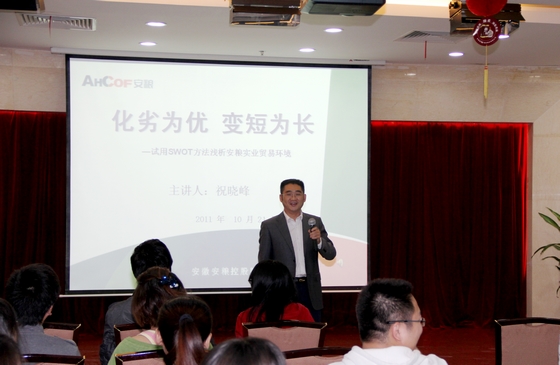 10月21日下午,公司辦公室在五樓多功能廳組織舉辦《化劣為優(yōu),變短為長——試用SWOT方法淺析安糧實(shí)業(yè)貿(mào)易環(huán)境》專題講座。本次講座由安糧實(shí)業(yè)總經(jīng)理助理祝曉峰(內(nèi)訓(xùn)師)主講。安糧實(shí)業(yè)貿(mào)易業(yè)務(wù)部門和公司系統(tǒng)相關(guān)業(yè)務(wù)部門、職能部室共計(jì)50多人參加了講座。