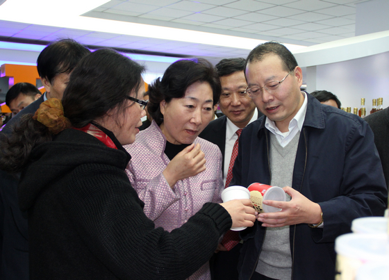 花建慧副省長(中)蒞臨安糧實(shí)業(yè)展廳并品嘗產(chǎn)品