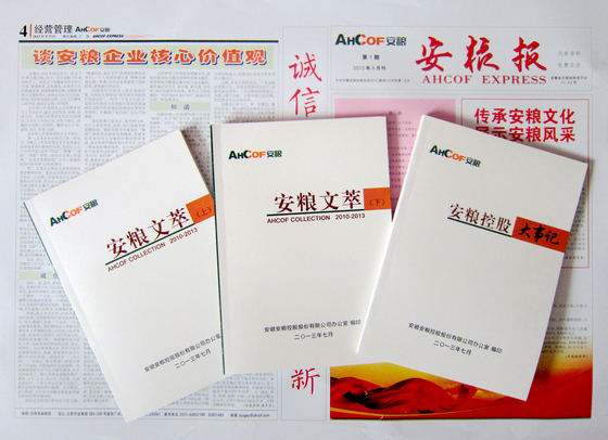 經(jīng)省新聞出版局批準,9月中旬,公司內(nèi)刊安糧報在試刊三期后正式創(chuàng)刊出版。國貿(mào)集團范陽董事長專門發(fā)來賀信,對安糧報創(chuàng)刊表示祝賀。同時,由辦公室編印的包括上級領導、安糧高管層和基層員工在公司網(wǎng)站發(fā)布的文章匯編——《安糧文萃》(上下冊)、內(nèi)容包括各子公司三年來重大事項的資料記錄——《安糧控股大事記》,也印發(fā)至各單位。