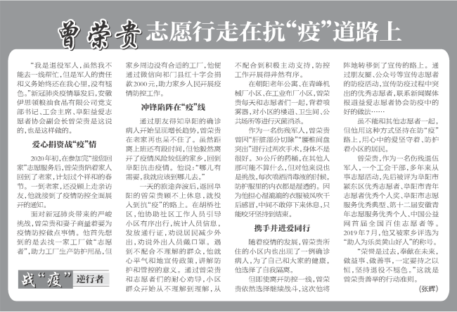 黃山人曾榮貴是安徽伊思頓糧油食品有限公司黨支部書記,他是一名傷殘退伍軍人,擔(dān)任阜陽益愛志愿者協(xié)會副會長,曾積極參與過大小百余次公益活動,被評選為“助人為樂黃山好人”稱號。在今年新冠病毒蔓延的特殊時期,曾榮貴不僅捐資戰(zhàn)“疫”,更沖鋒在前。正月初一,他就協(xié)同當(dāng)?shù)卮鍍晌e極投入到防控疫情一線,白天走進(jìn)村委會和公共場所開展防疫消毒,幫助村兩委工作人員開展出入人員管控;晚上編輯公眾號文章,宣傳防疫活動和防疫過程中的好做法,用行動踐行了共產(chǎn)黨員的初心使命,發(fā)揮了黨員的先鋒模范作用。