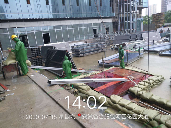 針對(duì)入梅以來嚴(yán)峻的防汛形勢(shì),已交付及在運(yùn)營(yíng)項(xiàng)目積極協(xié)調(diào)物業(yè)公司,共同迎戰(zhàn)強(qiáng)降水天氣。位于合作化路和南二環(huán)交口的安糧國(guó)貿(mào)中心是此次防汛形勢(shì)較嚴(yán)峻的重點(diǎn)項(xiàng)目,特別是降雨量突破合肥市歷史極值的7月18至19日,積水內(nèi)澇直接影響到地下室的安全。險(xiǎn)情出現(xiàn)時(shí),一線人員及時(shí)匯報(bào),各崗位人員在半個(gè)小時(shí)內(nèi)到崗參與排險(xiǎn)工作。項(xiàng)目部對(duì)地庫(kù)出入口等易形成倒灌水的危險(xiǎn)區(qū)域安排工作人員堆砌沙袋,打開集水井蓋板,保證積水最大流量的排放。同時(shí)配合唯品會(huì)工作人員啟動(dòng)區(qū)域排水泵,對(duì)易積水難排水區(qū)域進(jìn)行再清理再疏通,隨著南二環(huán)和合作化路積水水位逐漸下降,安糧國(guó)貿(mào)中心順利通過了此次防汛考驗(yàn)。
