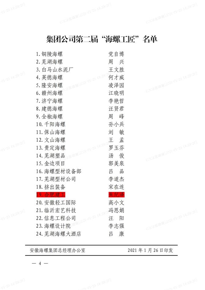 2020年1月26日,海螺集團(tuán)召開2021年工作會議暨第二屆“海螺工匠”表彰大會,授予24名職工“海螺工匠”的光榮稱號。合肥建工朱紀(jì)澤名列其中,成為安糧集團(tuán)系統(tǒng)內(nèi)首位獲此殊榮的員工。